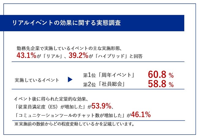 今回は、大企業(1,000名以上)に勤務する社内イベントの企画に携わる会社員102名を対象に、リアルイベントの効果に関する実態調査に関する調査を実施しました
