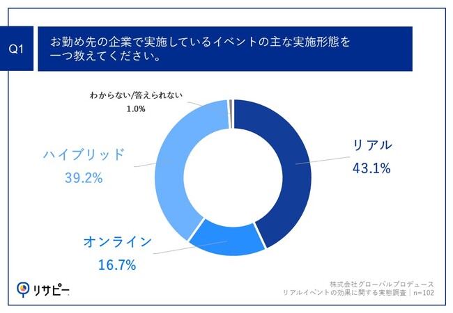 「Q1.お勤め先の企業で実施しているイベントの主な実施形態を一つ教えてください。」(n=102)と質問したところ、「リアル」が43.1%、「ハイブリッド」が39.2%という回答となりました。