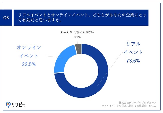 「Q8.リアルイベントとオンラインイベント、どちらがあなたの企業にとって有効だと思いますか。」(n=102)と質問したところ、「リアルイベント」が73.6%、「オンラインイベント」が22.5%という回答となりました。