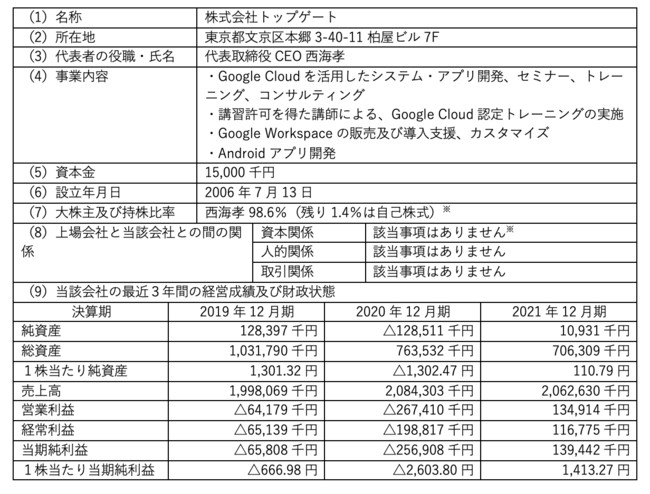 ※2022年3月31日に開示した「資金の貸付に関するお知らせ」の通り、株式会社トップゲートの代表取締役CEO西海孝氏への貸付に際して、同氏の保有する株式会社トップゲートの株式に対して質権設定による保全を行っております。なお、今回の株式取得により同氏との間の債権債務は解消されます。