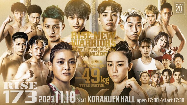 今回の『RISE173』では、メインイベントである『RISE NEW WARRIORS スーパーフライ級(-53kg)トーナメント 決勝戦』の他、『RISE QUEENミニフライ級(-49kg)タイトルマッチ』など11試合が開催されます。