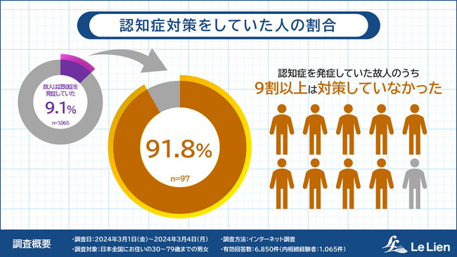 親の死による相続の経験者1,065人からの回答によると、故人が生前に認知症を発症していた割合は9.1%でした。そのうち91.8%は、任意後見や家族信託などといった認知症対策を行っていませんでした。