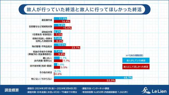 (11.5%)でした。一方で、故人に行ってほしかった終活のトップは「物の整理・不用品処分」(23.1%)で