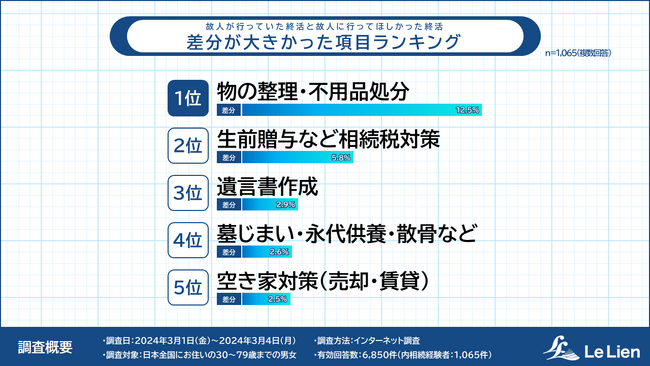 「故人が行っていた終活」と「故人に行ってほしかった終活」を比較したところ、最も差分が大きかったのは「物の整理・不用品の処分」(12.5%)でした。「生前贈与など相続税対策」(5.8%)、「遺言書作成」(2.9%)と続きました。