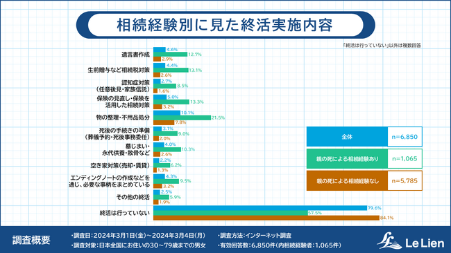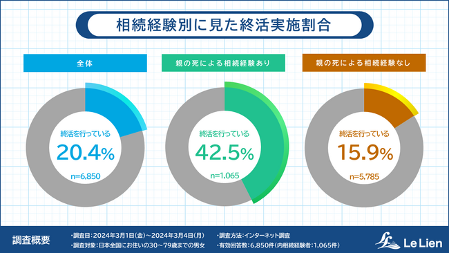 回答者全体6,850人の回答によると、自身の終活実施状況について、20.4%が「終活を行っている」と回答しました。親の死による相続の経験者1,065人に限ると42.5%と倍増する結果になりました。一方で、親の死による相続の経験がない人においては15.9%でした。親の死による相続の経験者と比較すると3倍近い違いとなりました。