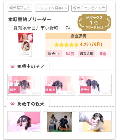「ブリーダーを探す」の検索結果では、受賞ブリーダーに限り金色の受賞バッジが表示されます。