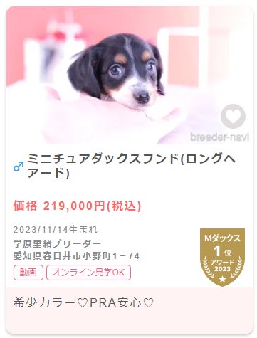 『ブリーダーナビアワード2023』受賞ブリーダーには、子犬の検索結果画面にバッジを表示します