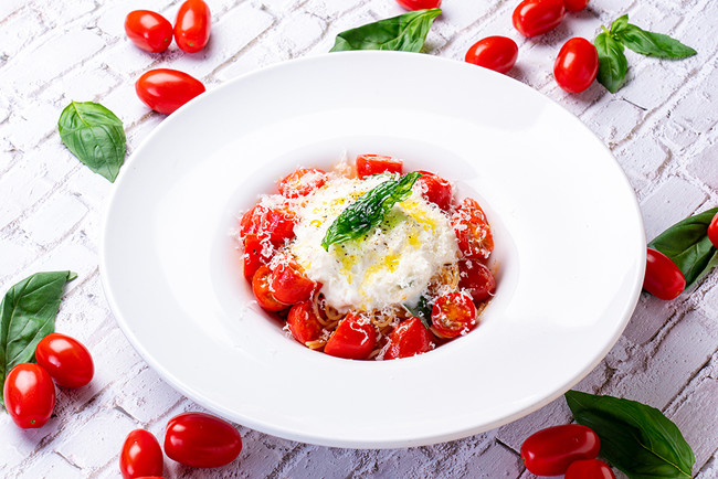メニュー名:北海道プレミアムトマト「純あま」とフレッシュモッツァレラチーズの冷製スパゲティ