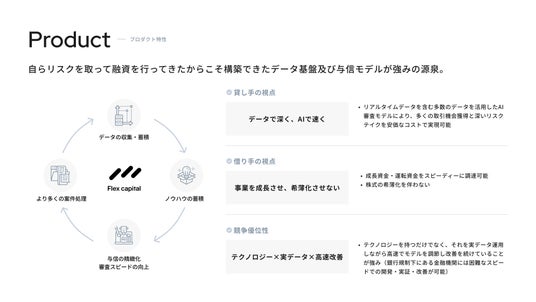 Flex Capitalは、2021年2月のサービス開始以来、テクノロジーを活用し、従来型の融資判断プロセスでは取り組みが容易ではなかったスタートアップ企業を中心に、融資実績を順調に拡大しています。「データで深く、AIで速く」をモットーとする独自の審査モデルは、API連携や生成AIを活用した膨大なオルタナティブデータの取得・解析と自社開発による機械学習モデルにより構築され、他には真似できない迅速かつ精度の高いリスク判断を実現。これにより以下に挙げられる特長をもつサービスを提供し、成長企業の成長加速を支援してきました。