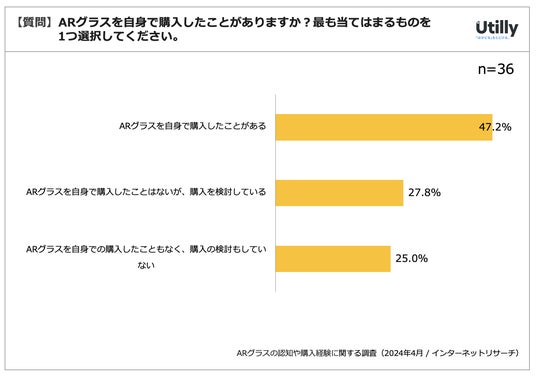 ARグラスについて「詳しく知っていて、説明することもできる」と回答した人のうち、47.2%が「ARグラスを自身で購入したことがある」と回答した。一方、25%は「自身での購入したこともなく、購入の検討もしていない」と回答した。