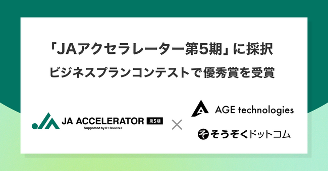 2023.6.6 株式会社AGE technologies(本社:東京都豊島区、代表取締役CEO:塩原優太、以下「AGE technologies」)は、一般社団法人 AgVenture Lab(本社:東京都千代田区、代表理事理事長:荻野浩輝)と株式会社ゼロワンブースター(本社:東京都千代田区、代表取締役 会長:鈴木規文、代表取締役 CEO:合田 ジョージ、以下「01Booster」)が共同で開催する「JAアクセラレーター第5期」(以下、本プログラム)に、採択されました。またAGE technologiesは、2023年5月25日に開催されたビジネスプランコンテストで、優秀賞を受賞しました。
