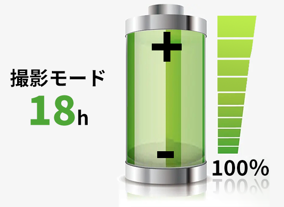 長時間の撮影を楽しんでいただけるように「RD09」は1800mAhの超大容量バッテリーを搭載しており、3時間フル充電すれば、なんと最大18時間連続撮影できます!さらに、充電しながら使用可能なので、モバイルバッテリーに接続しながら使用すれば記録中の電源切れの心配はありません。