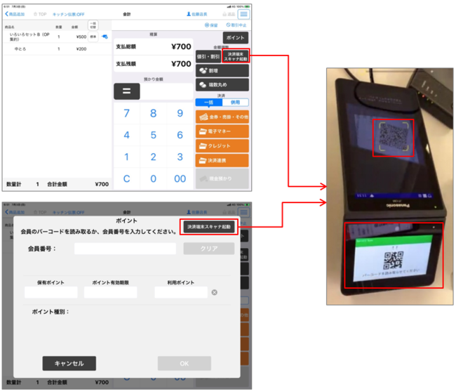会計画面とバーコード読み取り画面上に「決済端末スキャナ起動」ボタンが表示され、押下することでバーコードの読み取りが可能となります。