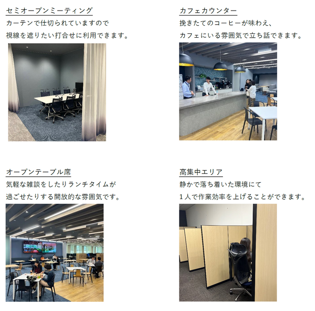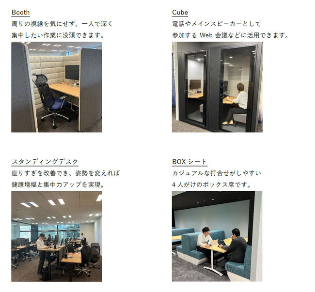 固定席を設けず、業務内容に適した場所・機能を、「高集中エリア」や「オープンデスク」「パネル付きオープンデスク」「Booth」「Cube」「Phone Booth」といった様々なタイプから選択し働くことができるオフィスになります。ケネディクスグループ社員が利用できる「ラウンジ」も設置し、ここでは気分を変えて作業したい時やケネディクスグループ社員同士が気軽に雑談して交流する時など、様々なシーンで利用できるよう設計しています。