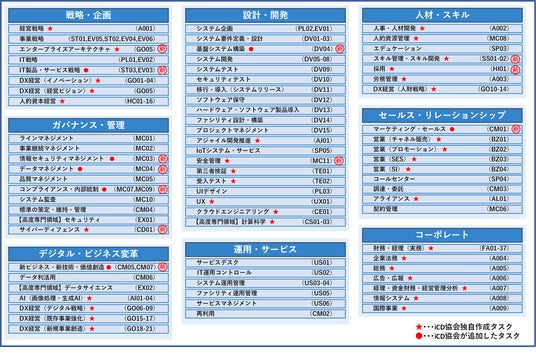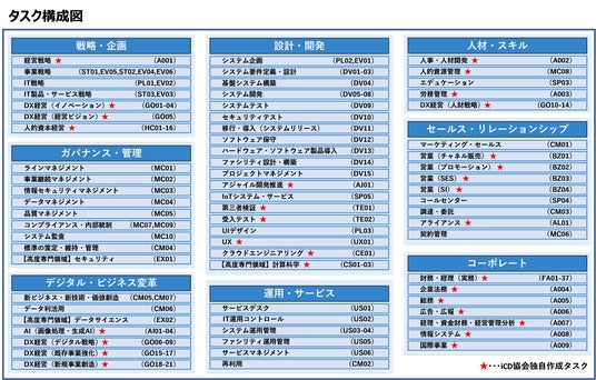 弊協会ではこれまで、iCDタスクの拡充に関しましては、前述のSFIAバージョンアップの際やデジタルスキル標準の発表、既存iCDユーザーの要望などを契機として、大分類単位でタスクの追加を行ってまいりました。これまでに追加し、すでに公表済みのタスクは次の通りです。