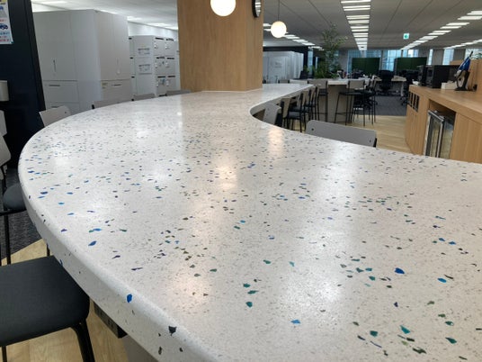 コクヨは、お客様から太陽光パネルのリサイクル素材を用いた事務什器の設計施工を求められておりました。そこへ浜田が行う太陽光パネルリサイクル処理後に発生するPVガラスを一部左官材料として以下写真の通り、オフィスに設置するバーカウンターの天板部分に使用する左官材料として提供を行いました。