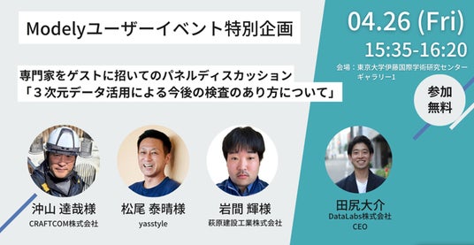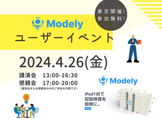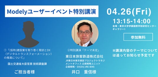 この度、導入企業の皆様がModelyを更に活用していただく契機になるよう、初のユーザーイベントを2024年4月26日に開催いたします!ユーザー様の先進的な運用事例を発表いただくだけでなく、国交省技術調査課や工事発注者であるJR東日本のDXチームからキーパーソンを招いた特別講演、また3次元データ活用の知見をお持ちのスペシャルゲストの方々によるパネルディスカッションも実施。参加費無料で懇親会もございます!