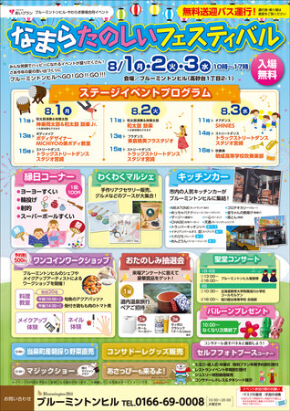 株式会社あいプラン(北海道札幌市・代表取締役・新道喜信) が、2022年8月1日(月)-3日(水)にブルーミントンヒル(旭川市)で『なまらたのしいフェスティバル』を開催いたします。みんな笑顔でハッピーになれる催しとして様々な企画をご用意いたしました。ご家族・お友達など皆様お誘いあわせの上、ご参加ください。