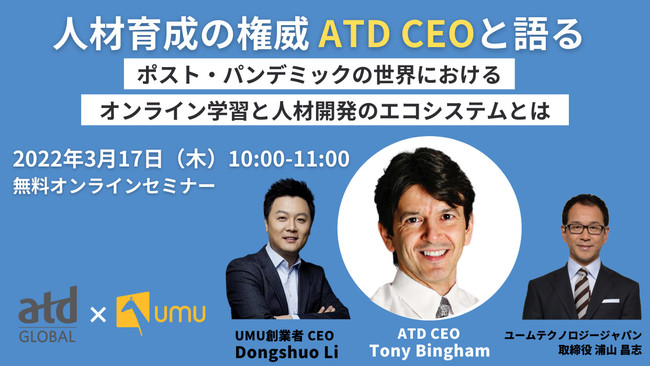 オンライン学習プラットフォーム「UMU(ユーム)」を展開しているユームテクノロジージャパン株式会社(本社:東京都渋谷区、代表取締役:松田しゅう平、https://www.umujapan.co.jp、以下、ユームテクノロジー)は、人材育成の権威ATD CEOと語るオンラインセミナー「ポスト・パンデミックの世界におけるオンライン学習と人材開発のエコシステムとは」を2022年3月17日(木)の10:00-11:00に開催いたします。