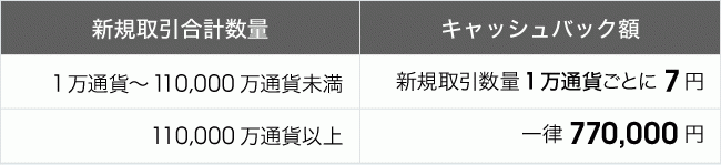 ・新規取引合計数量が500万通貨 ⇒ 3,500円キャッシュバック