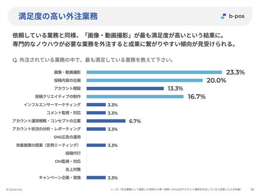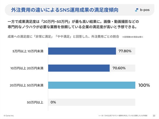 最適な代行・外注サービス選定をサポートする、BPOサービス比較サイト「b-pos」を運営する、株式会社Cone(本社:大阪府大阪市、代表取締役:佐藤 立樹、以下「当社」)は、企業のSNS公式アカウント運用における外注活用の実態調査を実施し、調査内容をまとめたホワイトペーパーを公開しました。本調査では、内製運用よりも外注活用企業の方が成果満足度が高い、月間20万円~50万円の費用帯で外注している企業の成果満足度が最も高いなどの事実が明らかになりました。