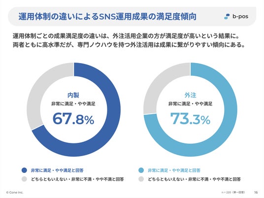 内製でSNS運用を実施している企業と、支援会社を活用してSNS運用を実施している企業それぞれに、成果に対する満足度を聞いたところ、内製企業で「非常に満足」「やや満足」と回答した割合は約68%、外注企業では74%という結果になりました。