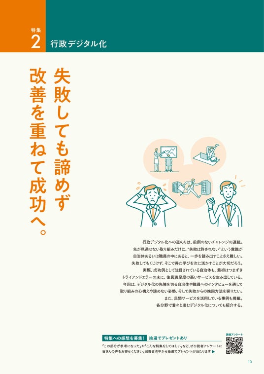 今号の特集1では、「[地域交通]“共創”から始まる交通網の再構築。」をテーマに、熊本県、熊本県熊本市、滋賀県彦根市、鳥取県伯耆町(ほうきちょう)などの事例をご紹介しております。特集2では、「[行政デジタル化]失敗しても諦めず改善を重ねて成功へ。」をテーマに、東京都、宮崎県都城市、埼玉県深谷市などの取り組みをご紹介しております。