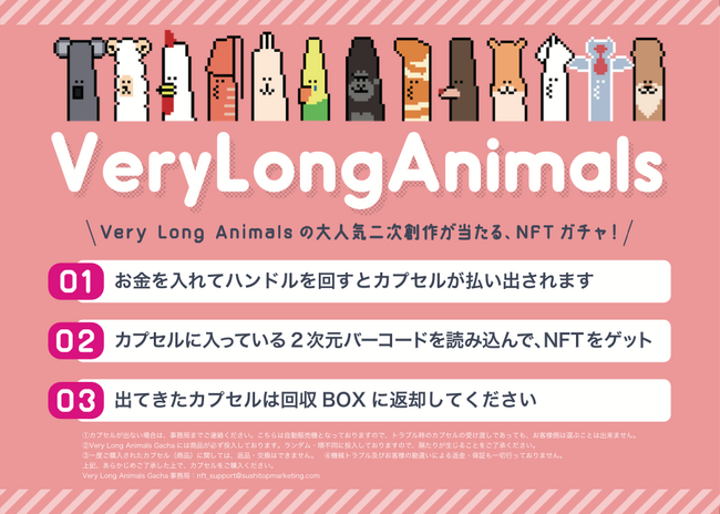 SUSHI TOP MARKETING株式会社(本社:東京都千代田区、代表取締役CEO:徳永大輔、以下「当社」)は、VeryLongAmimalsの二次創作NFTが手に入るVeryLongなNFT自動販売機を開発しました。一般的な飲料自動販売機で商品を買うのと同じように現金でNFTを購入できるため、NFT自動販売機を商業施設や映画館などに置くことで、NFTを日常的に販売することを可能にします。