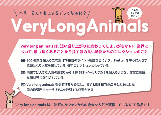 VeryLongAnimals(ベリロン)とは、世界で一番長いNFTプロジェクトです!ベリロンでは、楽しむだけで得られるポイント(ポテト)でNFTやグッズが手に入ったり、許可なしで商用利用可能な二次創作を楽しめます!