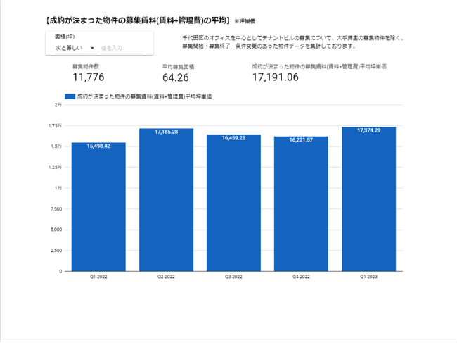 成約面積、件数が前期比で増加、値ごろ感のある物件の入居状況は比較的好調です。結果、競合物件が減少したことにより成約賃料の平均金額が引き上げられています。(下図参照)