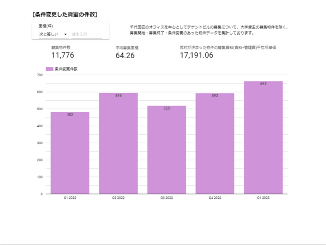 最後のグラフは、賃貸条件の変更をした貸室件数の推移を表現しています。2022年第2四半期までは条件変更件数が増えていましたが、2022年第3四半期に一度条件の変更が減少します。以降は2023年第1四半期に至るまで条件変更の増加が継続しています。貸出面積の大幅な減少・市況感を正しく判断した物件による賃料の引き上げなどの募集条件の変更が相次いだ状況がうかがえます。