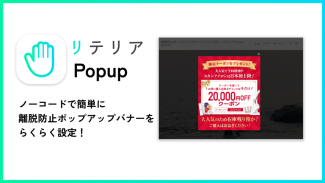 「離脱防止ポップアップバナー挿入アプリ|リテリア Popup」は、Shopifyでモーダルウィンドウを実現するアプリです。ユーザーの挙動に応じて、指定したポップアップを出現させることが可能になっています。今回、こちらのアプリの詳細な解説記事を、株式会社リテリア公式HPに追加致しました。