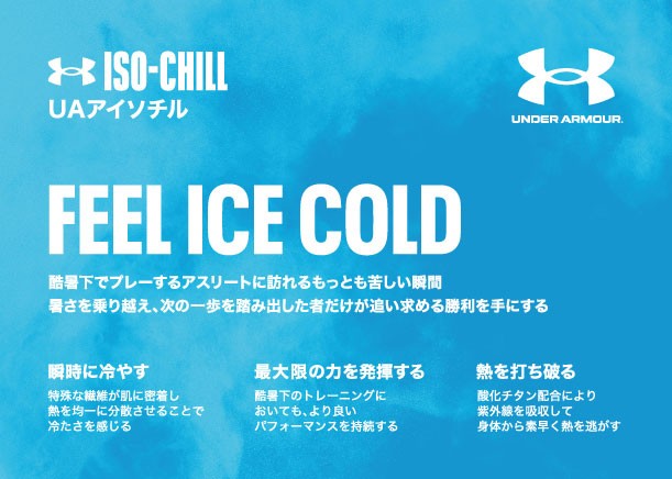 今回取り扱いを開始するアンダーアーマー「ISO-CHILL(アイソチル)」は、Aqua-X(冷感吸汗速乾糸)ナイロン糸を採用した、特殊テクノロジーでつくられた素材のウェアです。