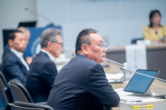 国連大学本部ビル エリザベス・ローズ会議場内に集まった経営トップたちを前に、GCNJの磯崎功典代表理事(キリンホールディングス株式会社代表取締役会長CEO)がGCNJサミット2026の意義を語り、開会。