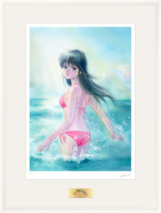 連載開始から40年、まつもと泉先生が亡くなられた今も、日本で世界で愛され続ける『きまぐれオレンジ★︎ロード』。今も作品を愛する多くの皆さんに支えられています。だからこそ描き下ろす機会その度毎に、キャラクターの心が今も生きてここにある事が伝わるような絵を描きたいと思っています。陽が傾いて夕暮れが近づく中、海に分け入っていくまどかを追う恭介の方を振り向いた刹那を絵にしました。隠していたまどかの想いをその視線から感じとっていただけたらと思います。