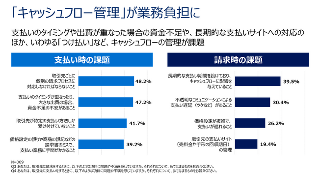 ■請求時に関わる課題として、キャッシュフロー管理が最も多く挙げられました。特に、長期的な支払い期間によるキャッシュフローへの影響(39.5%)や、不透明なコミュニケーションによる支払い遅延(ツケ払い)(30.4%)といった入金までの期間に関する不満が挙げられています。支払い時においても、資金不足に対する不安(47.2%)が2番目に多い回答として寄せられたことから、キャッシュフロー管理が請求/支払いに共通する課題となっていることが明らかとなりました。