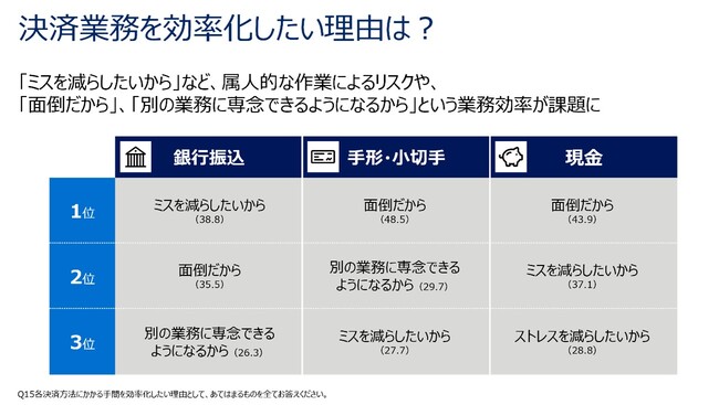 ■効率化したい決済方法を聞いたところ、「銀行振込」(49.2%)「現金」(42.7%)、「手形・小切手」(32.7%)の順で回答が寄せられました。それぞれの決済方法を効率化したい主な理由としては、「ミスを減らしたい」という属人的な作業によるリスクのほか、「面倒だから」や「別の業務に専念できるようになるから」といった業務効率が挙げられました。