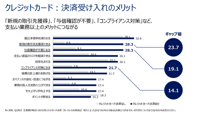 ■取引先への請求の際に、クレジットカード決済を受け入れたい回答者は44.3%で、すでに受け入れを開始している回答者は、そうでない場合と比べて、「新規の取引先を獲得できる」(28.3%)、「与信確認が不要になる」(28.3%)、「コンプライアンス対策になる」(21.7%)といった、決済業務以上のメリットを実感していることが明らかとなっています。