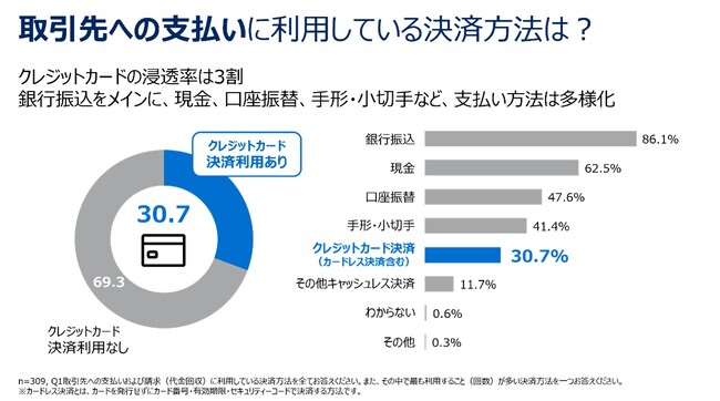 今回の調査では、建設・建築業が直面している全体の課題として、「人材不足」(51.8%)や「労働人口の高齢化」(38.5%)が挙げられ、“2024年問題”と呼ばれる、労働環境の改善が急務となっていることが明らかになりました。経理業務に目を向けてみると、銀行振込や手形をはじめとした複数の決済手段が利用される中、特に支払い業務において、属人的な作業の効率化が課題であることがわかりました。今後の決済手段の利用意向としては、クレジットカード支払い希望が58.3%となり、業務の効率化のみならず、決済業務以上のメリットも期待されていることが明らかとなりました。