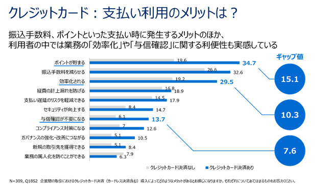 ■支払いの際、今後希望する方法として、58.3%がクレジットカード決済を利用したいと回答しており、現状(30.7%)の約2倍となっています。すでに利用している回答者にメリットを聞いてみると、「ポイントが貯まる」(34.7%)や「振込手数料を減らせる」(32.6%)といった点が寄せられたほか、「効率化される」(29.5%)、「与信審査が不要になる」(13.7%)では、非利用者と比較しても大きなメリットとして挙げられています。