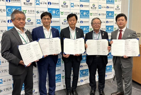 ※画像は向かって左から、大月市長 小林信保氏、富士川町長 望月利樹氏、那智勝浦町長 堀順一郎氏、益子町長廣田茂十郎氏、日本コムシンク株式会社 代表取締役会長兼社長 山里真元