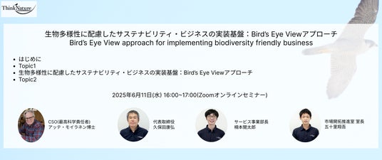 このセミナーでは、ネイチャーポジティブビジネスの科学的実装基盤を解説し、Bird’s Eye Viewアプローチの実践例を、シンク・ネイチャーの支援事例を元に紹介します。
