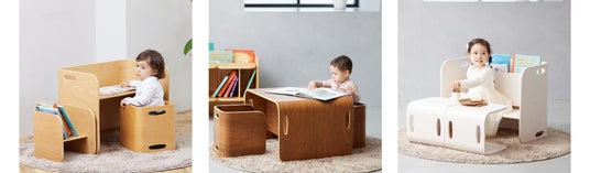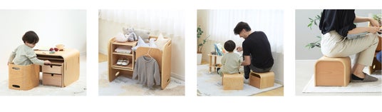 「コロコロチェア&デスク」は、向きを変えることで勉強デスク、ベンチ、ローテーブル、本棚と様々な形に変化するチェアとデスクのセットです。一般的に子ども用の家具は平均使用期間が2年間程と言われていますが、コロコロチェア&デスクは子どもが成長した後も長く使い続けられる、機能性に優れた商品です。
