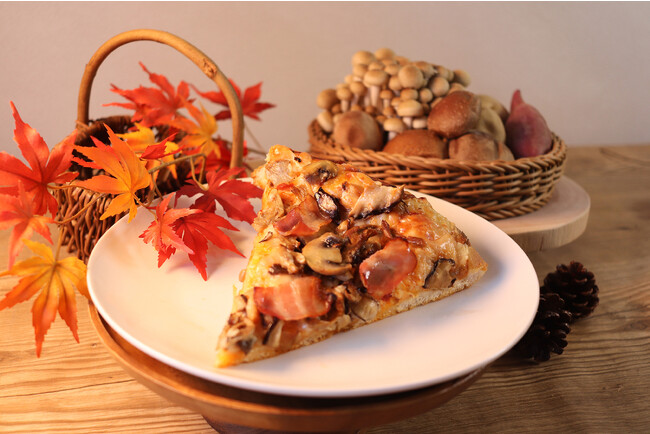 商品特徴:きのことベーコンを贅沢に使用した秋の味覚たっぷりのピザ。ボリュームたっぷりのピザで、冬眠前の腹ごしらえはバッチリ!