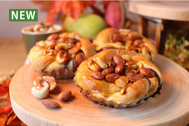 商品特徴:ふわふわのパン生地にキャラメルがけしたミックスナッツをたっぷりとトッピング。栄養が豊富なナッツは、くまさんの貴重な食料。たっぷり食べて冬に備えよう。
