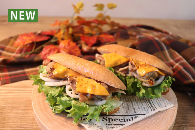 商品特徴:グリルチキンにレンコンとごぼうの根菜サラダをあわせたザクザク食感が楽しめるサンド。具沢山な野菜とチキンで、冬眠前に栄養チャージ!