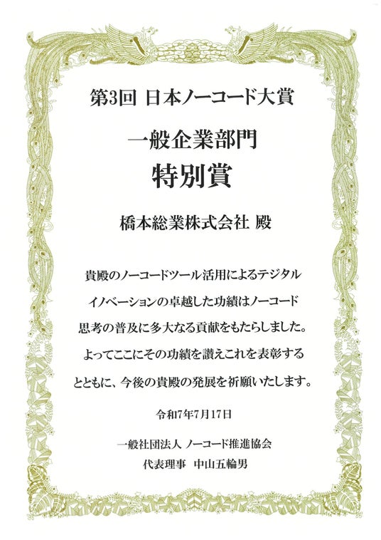 橋本総業株式会社(代表取締役社長:阪田貞一)は、7月17日開催の一般社団法人ノーコード推進協会(NCPA)主催「第3回日本ノーコード大賞」において「特別賞」を受賞いたしました。