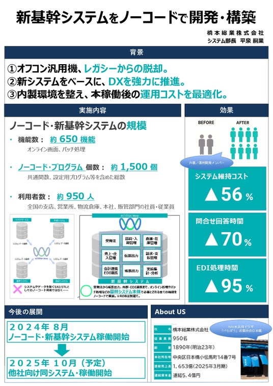 2021年に新基幹システム刷新プロジェクトをスタートし、旧システム画面デザインの踏襲、画面とビジネスロジックの分離、バッチ処理のノーコード開発、紙出力帳票のペーパーレス化等を、ノーコード型プログラム1,500個(650機能)で実現し、3年半の歳月を経て、2024年8月にノーコード型新基幹システムを稼働しました。