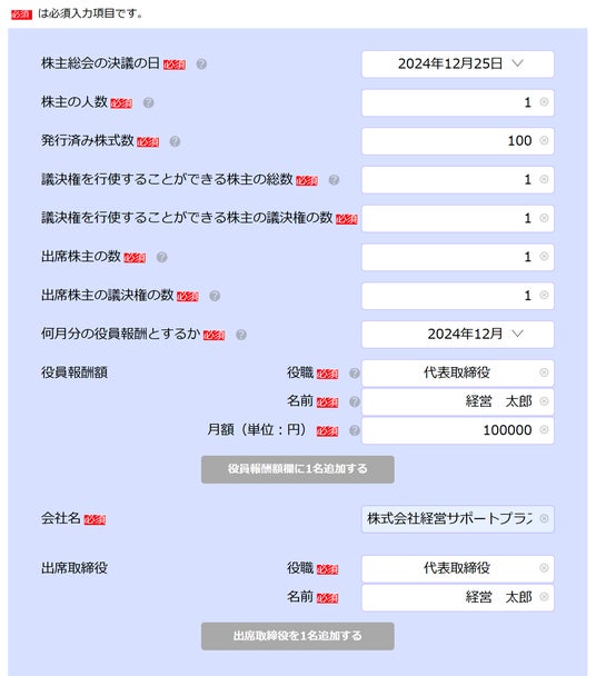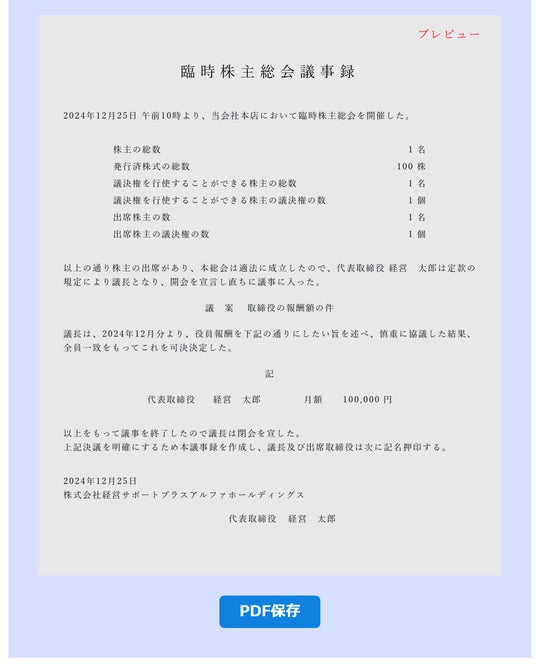 起業家のチャレンジを総合的に支援する株式会社経営サポートプラスアルファホールディングス(所在地:東京都豊島区)および税理士法人経営サポートプラスアルファ(同左)は、役員報酬を議決する株主総会に特化した「WEB完結|役員報酬を決議する株主総会議事録|雛形」を提供しています。