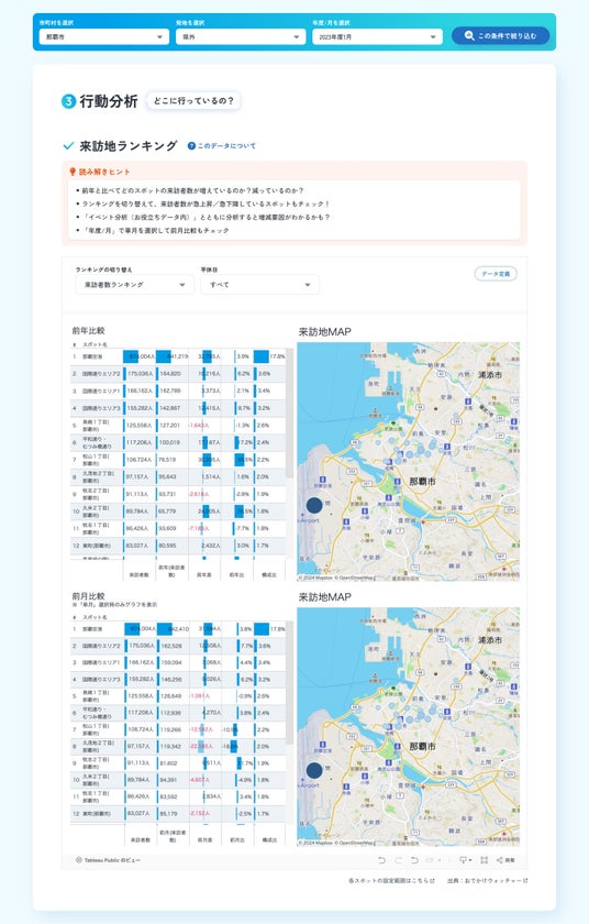 「おきなわ観光地域カルテ」は、ブログウォッチャーがデータ提供するデジタル観光 人流モニタリングサービス「おでかけウォッチャー」を活用し、沖縄県における観光客の動向を市町村別にわかりやすく可視化した観光マーケティングレポートです。昨年9月にリリースしたプロトタイプ版(試作版)の検証では、地域の担当者が観光振興を推進するにあたり、「何をどのように見たいのか?」「何がわかれば原因や仮説を考えたり、意思決定できるのか?」など現場目線のキャッチアップに注力。専門的な分析スキルやダッシュボード(*1)の操作経験がない担当者でも、「みて・わかって・できる」状態を目指し、逆算型で開発した「思考連動型ダッシュボード」という点で全国初の取り組みとなります。